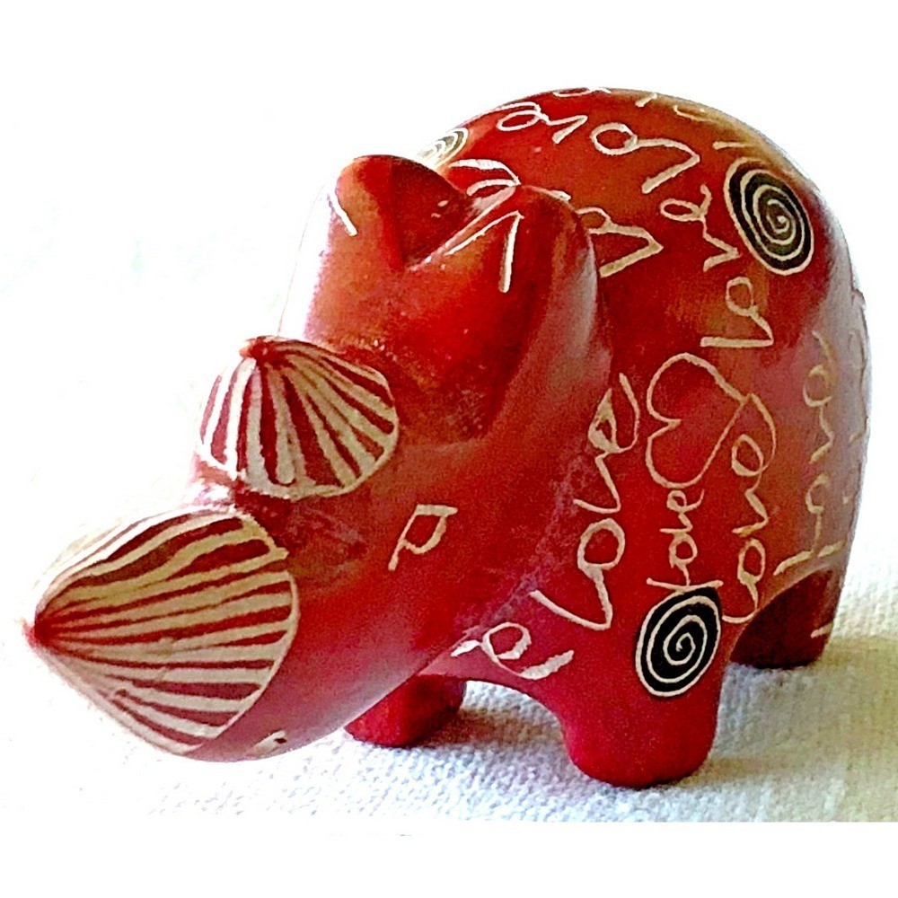 Mini sculpture of cute rhino incised with word “Love”. Each soapstone rhino is unique in color, ornament, and crafted details.