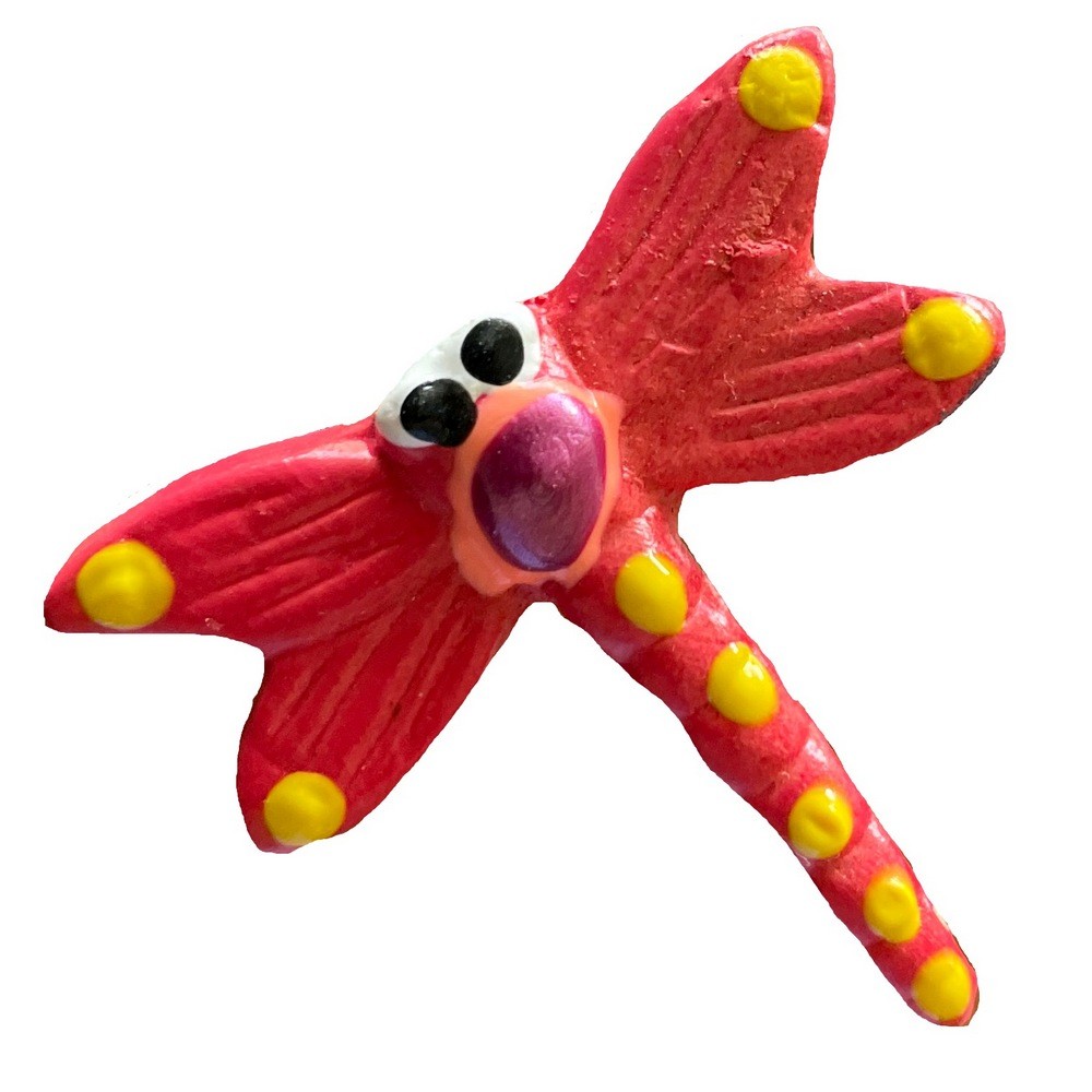 Unique, handmade, decorative Dragonfly made from clay on top of 20” wooden garden stake,