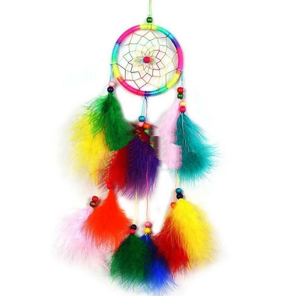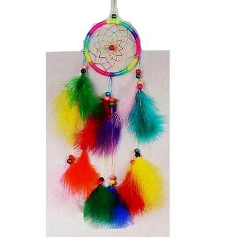 The dreamcatcher is handmade from colorful feather, beads, satin and cotton threads.