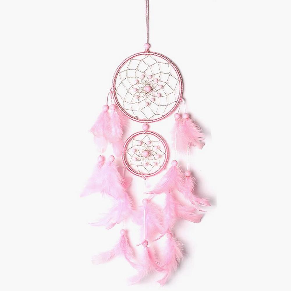 The dreamcatcher is handmade from pink feather, colorful beads, satin and cotton threads.