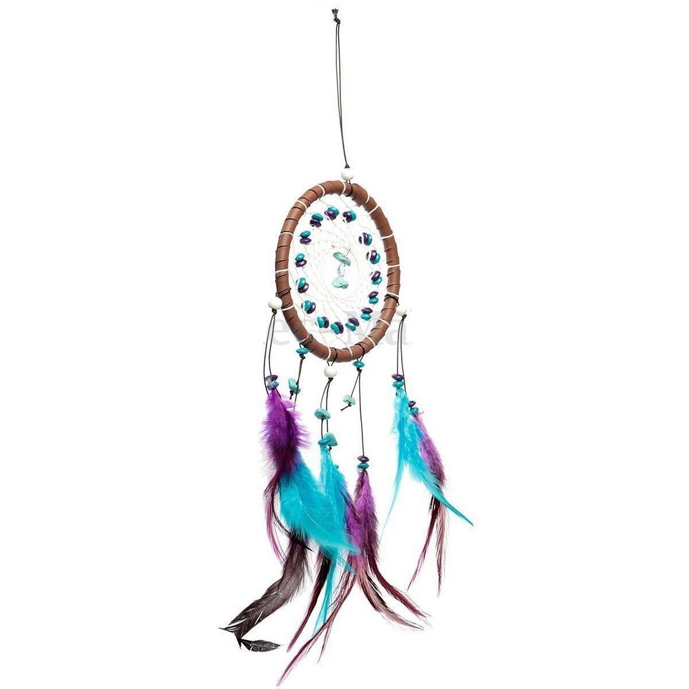 The dreamcatcher is handmade from colorful feather, turquoise beads, satin and cotton threads.