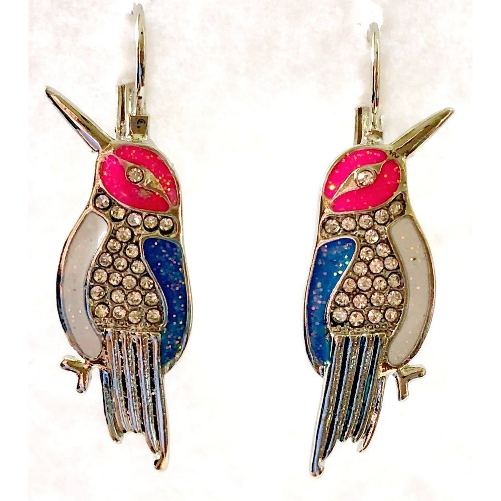 Cute enameled bird earrings decorated with rhinestones, 1.5” in length, 0.5” wide.