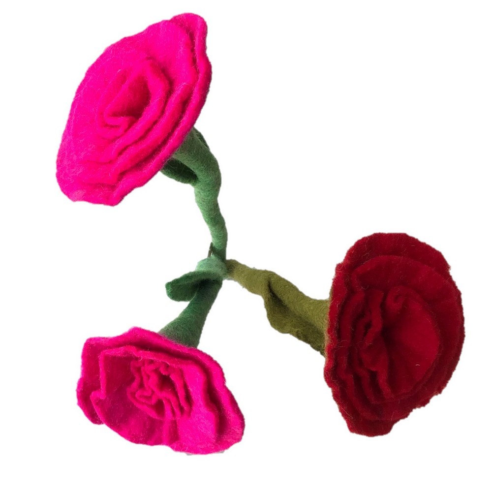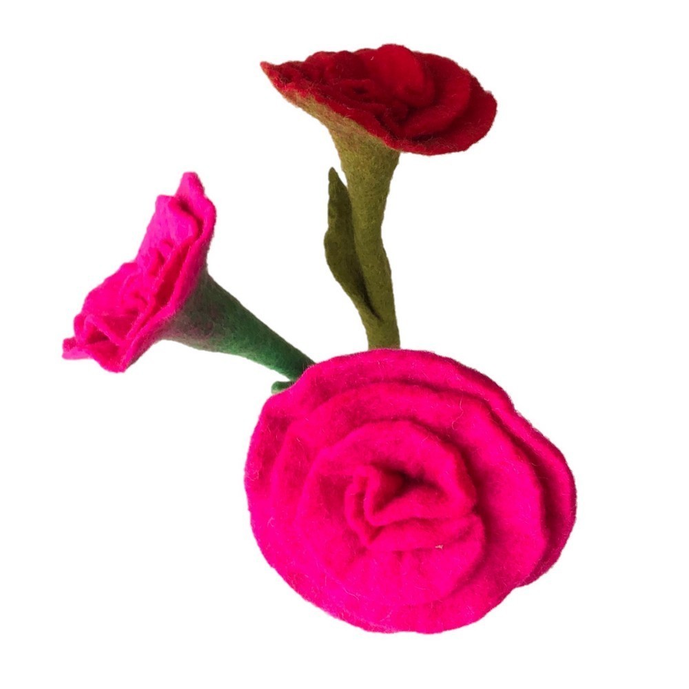 A felt flower is attached to a flexible wire stem and then wire is felted again with wool.