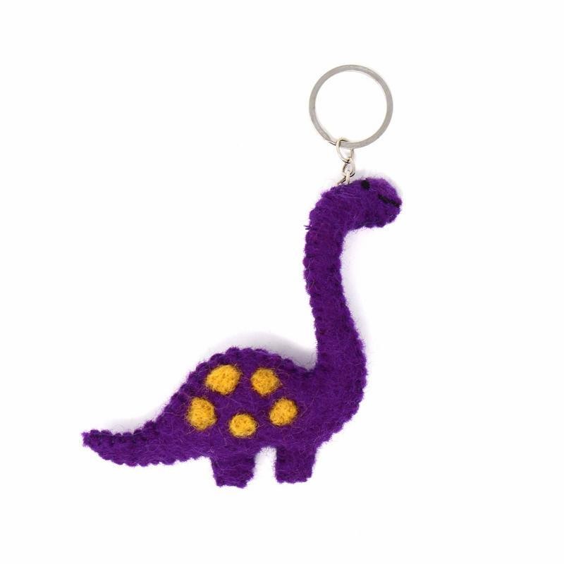 This handmade felt Brontosaurus key chain is 4 inches by 3.5 inches in size, made from natural wool and colored with Azo-Free dyes.