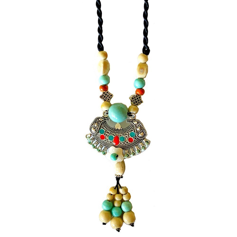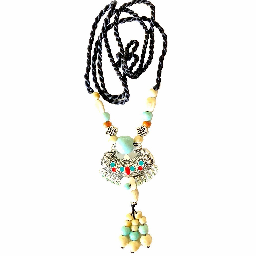 A silk rope is attached to a bunch of colorful Raku beads and adorned with metal pendant.
