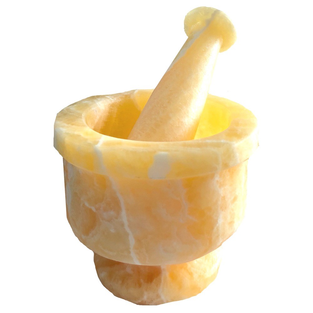 Uniquely crafted from exotic Yellow Onyx, the Mortar is 4 ” tall, 4” wide, Pestle is 4.5” tall.