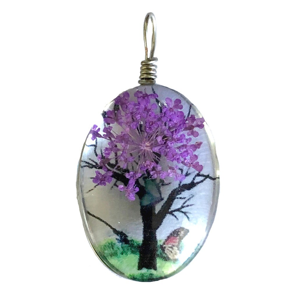 Unique Glass Pendant, Oval, with Real Dried Flowers inside, about 1” long.