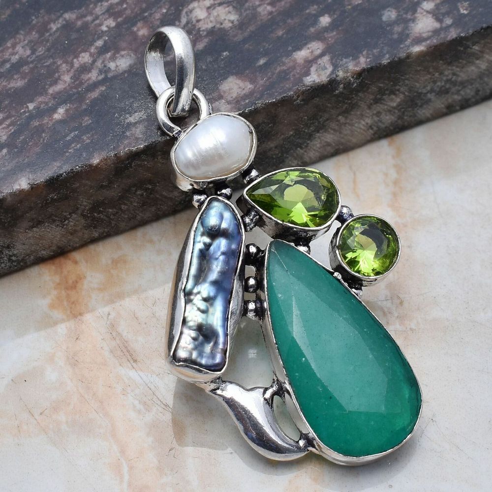 Beautiful handmade 925 Sterling Silver Pendant with Emerald and Biwa Pearl.
