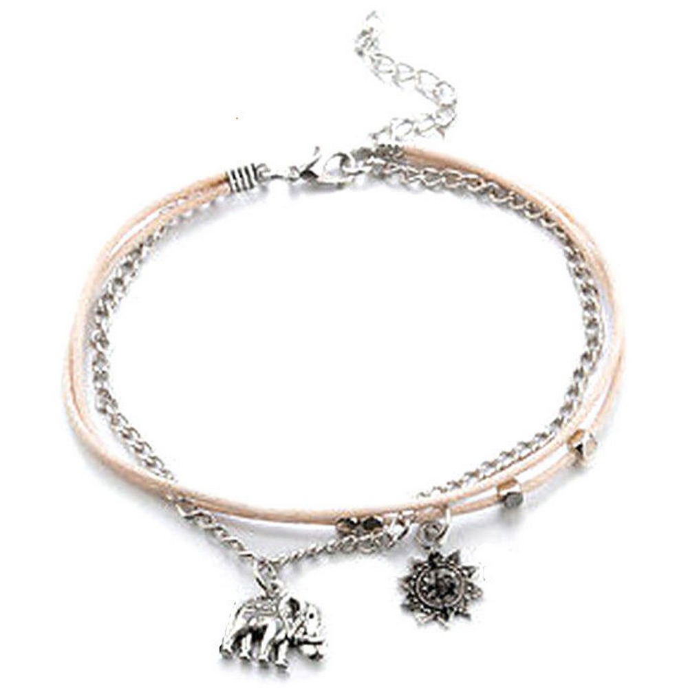 Elegant and light silver color ankle bracelet adorned with “Good Luck” Elephant and the Sun pendants.