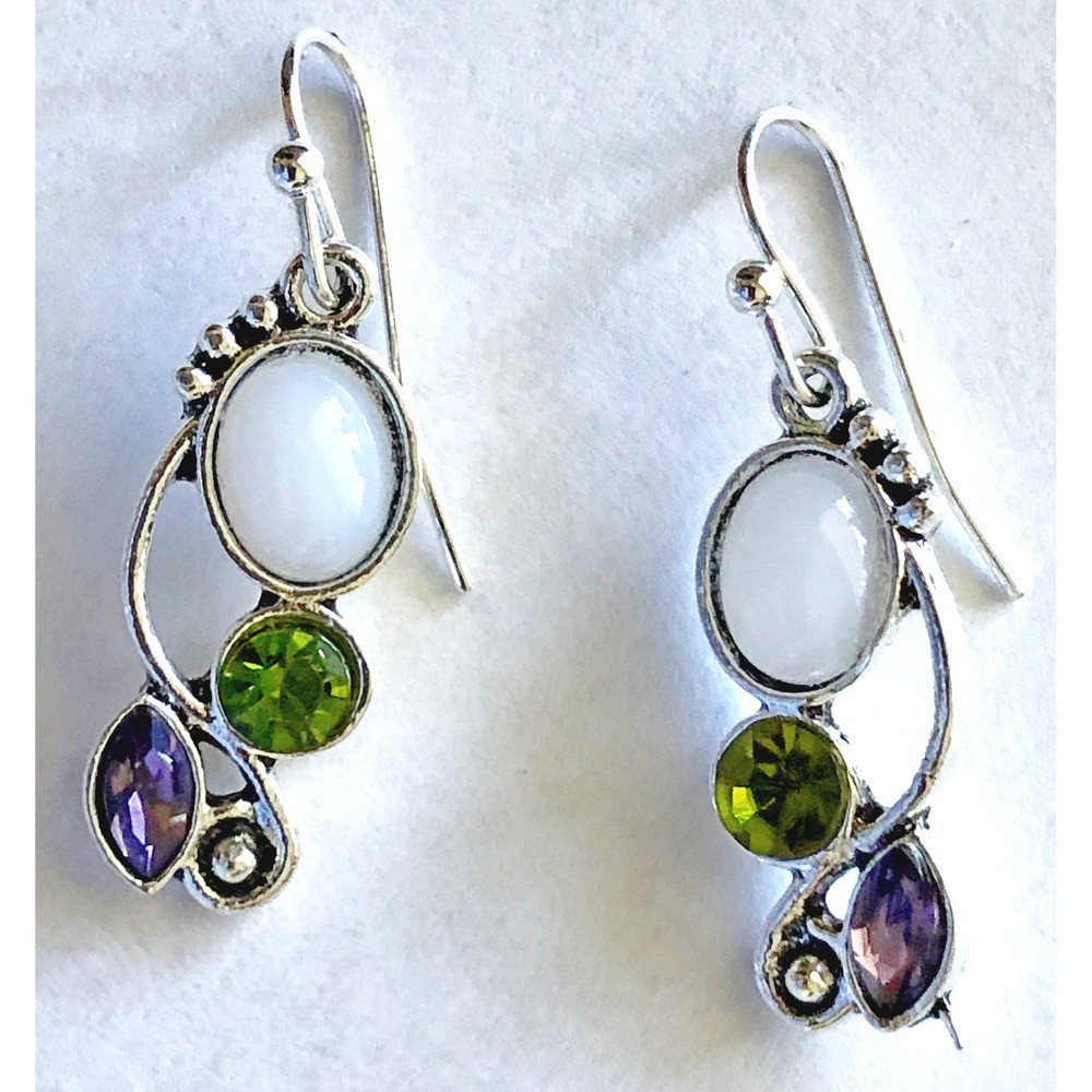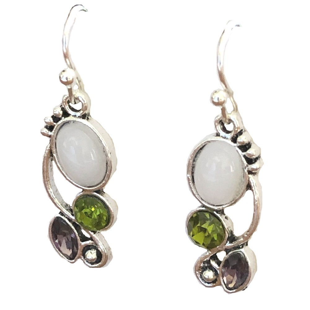 Elegant Silver Plated earrings, adorned with Moonstone, Peridot and Amethyst, about 1” long.