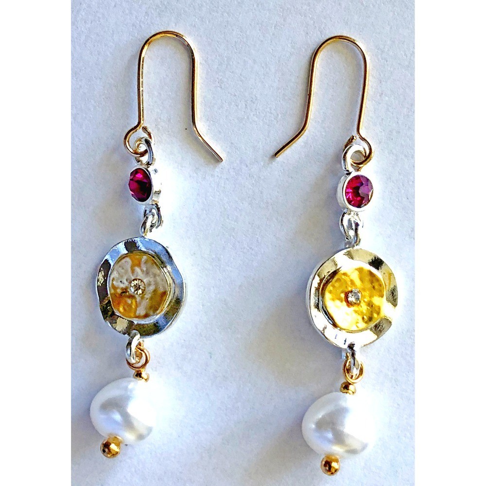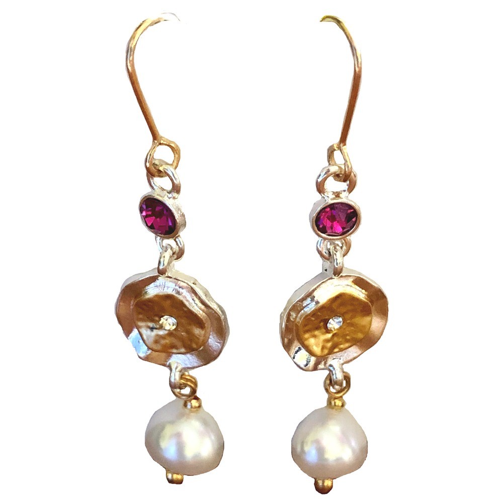 Elegant Silver Plated earrings, adorned with Pearl, Garnet Stone and a touch of Gold, about 2” long.