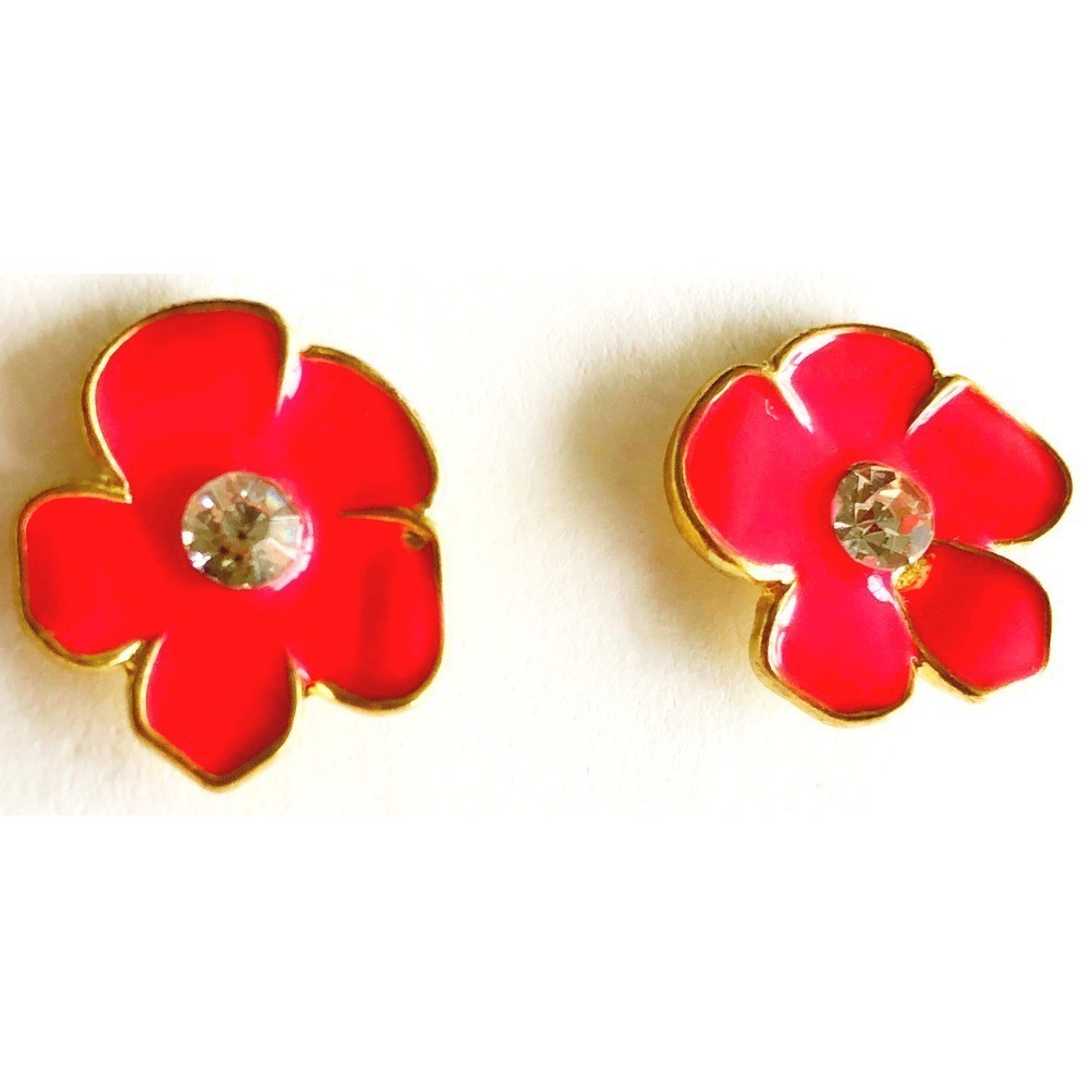 Small Red Flower Decorated with Rhinestones Stud Earrings, 0.75” wide.